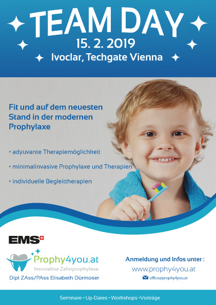 Fit und auf dem neuesten Stand in der individuellen Prophylaxe. Individuelle Begleittherapien Es geht auch anders- minimalinvasive Prophylaxe Individuelle Behandlungsstrategie in der modernen Prophylaxe Kursinhalt: Was hat sich geändert in der Prophylaxe Ganzheitliche Möglichkeiten und Zungendiagnose Welche modernen und erfolgreiche Therapiemöglichkeiten gibt es Biofilmmangement-minimalinvasiv „Kratzt du noch oder strahlst du schon“ Prophylaxe- Workshop am Phantom Individuelle Hilfsmittel- was können Vitamine & Co in der UPT Referentin: Petra Natter, BA Dentalhygienikerin Elisabeth Dürmoser Dipl ZAss/PAss Kurszeit: 09:00- 12:30 und 13:30- 17:30 inkl. Verpflegung – Skripten- Zertifikat Teilnahmegebühr: Frühbucher bis 15.Jänner 2019 185.- danach 205.- Maximale Teilnehmeranzahl: 25 Teamday Flyer herunterladen: Flyer-Teamday-prophy4you.at